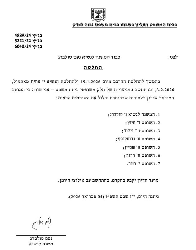 בהחלטתו כתב השופט: “בהמשך להחלטת ההרכב מיום 19.1.2026 ולהחלטת הנשיא י’ עמית מאתמול, 3.2.2026, ובהתחשב במניעויות של חלק משופטי בית המשפט – אני מורה כי המותב המורחב שידון בעתירות שבכותרת יכלול את השופטים הבאים. מועד הדיון יקבע בהקדם, בהתחשב עם אילוצי היומן”.