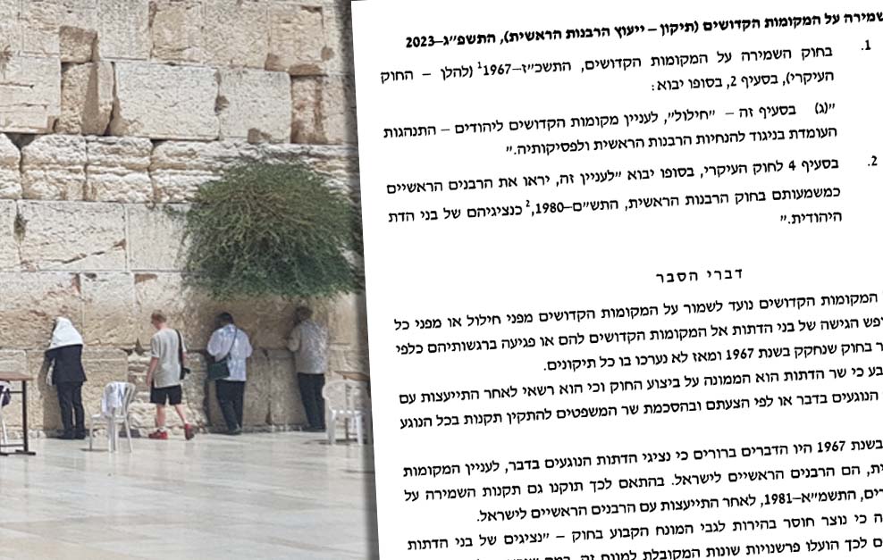 בעקבות פסיקת בג”צ בנוגע לכותל המערבי, שר המשפטים יריב לוין יביא מחר (ראשון) להצבעה בוועדת שרים לחקיקה, את הצעת ‘חוק הכותל’ שמטרתו להביא לשמירה על המקומות הקדושים מפני מהלכים של חילול הקודש. בהצעת החוק ייקבע כי היחידים שיהיו ראויים לקבוע מהו חילול הקודש במקומות הקדושים, וכן את הקביעה לקדושת המקום, אלו הרבנים הראשיים בלבד, ולא שום בית משפט.
