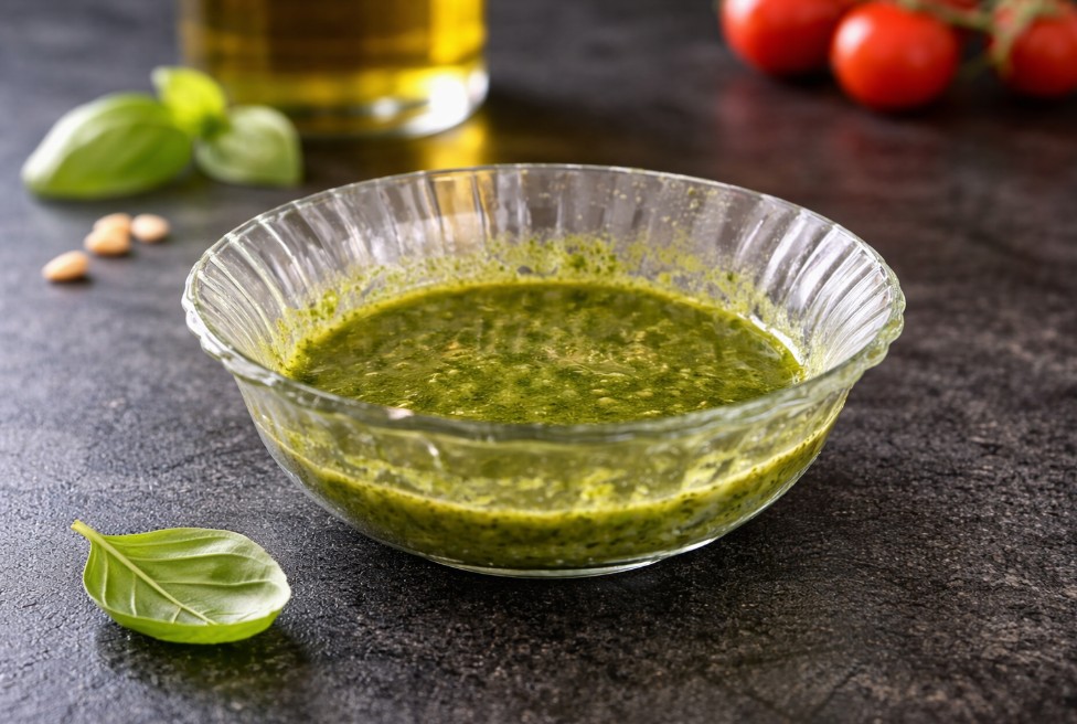 להכניס תחילה את העלי בזיליקום לתוך קוצץ מזון. לאחר מכן להוסיף לאט בכמה פעמים את השמן זית. כשזה מקבל את המרקם להוסיף את המלח ואת שיני השום ולהמשיך להפעיל את הקוצץ מזון עד שהכל ניהיה סמיך ללא כל חתיכות עבות.