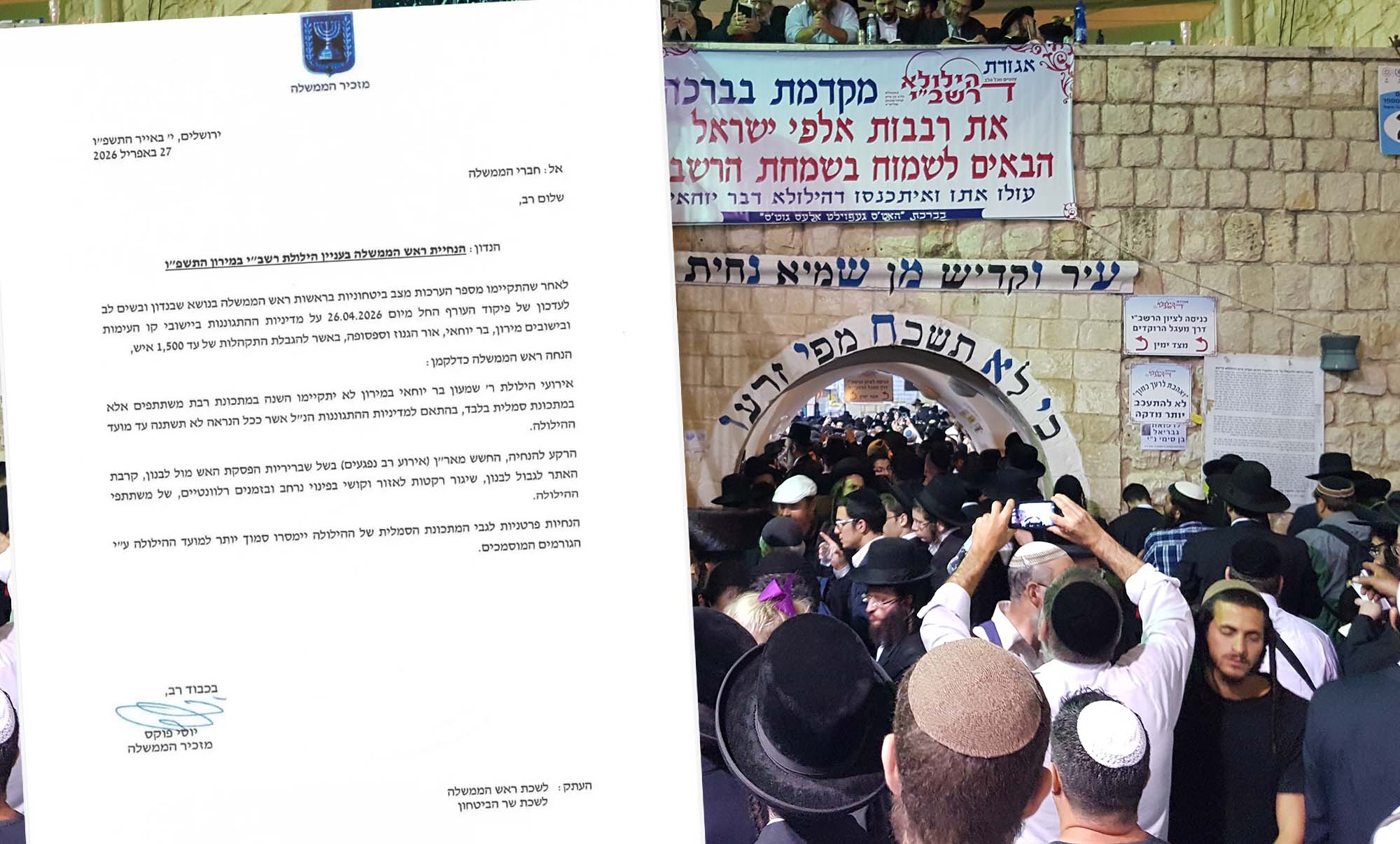 בהודעה ששלח הלילה (ראשון) מזכיר הממשל היוסי פוקס אל השרים, נכתב כי “לאחר שהתקיימו מספר הערכות מצב ביטחוניות בראשות ראש הממשלה בנושא שבנדון, ובשים לב לעדכון של פיקוד העורף מאמש על מדיניות התגוננות ביישובי קו העימות וביישובים מירון, בר יוחאי, אור הגנוז וספסופה באשר להגבלת התקהלות של עד 1,500 איש, הנחה ראש הממשלה כי אירוע הילולת רשב”י במירון לא יתקיימו השנה במתכונת רבת משתתפים אלא במתכונת סמלית בלבד, בהתאם למדיניות ההתגוננות הנ”ל אשר ככל הנראה לא תשתנה עד מועד ההילולא.
