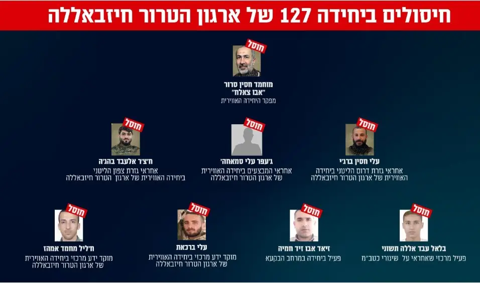 לצד נכסי היחידה, צה”ל פועל לסכל את פעיליה ומפקדיה. אתמול (שלישי), בתקיפה ממוקדת בביירות חוסל גם אחראי המבצעים של היחידה האווירית, ג׳עפר עלי סמאחה׳ אשר הכווין ופיקד על מתווי טרור אוויריים רבים, ביניהם ירי של טילי שיוט וכלי טיס בלתי מייואשים לעבר עורף מדינת ישראל. בנוסף היה אחראי על תיאום המתווים בין היחידות השונות בארגון הטרור חיזבאללה. סמאחה׳ שימש כסגנו של מפקד היחידה (127) והיה בכיר בה למעלה מעשר שנים.