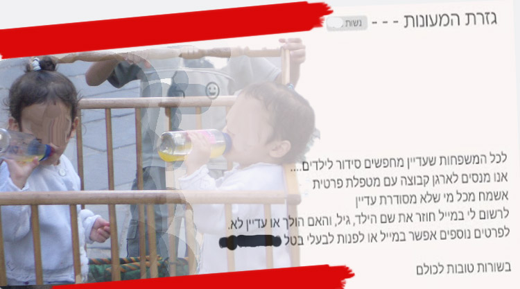 בריכוז חרדי אחר בצפון התארגנו באמצעות קבוצה באימייל תחת הכותרת ‘גזירת המעונות’: “בהודעה שנשלחה היום נכתב: “לכל המשפחות שעדיין מחפשים סידור לילדים. אנו מנסים לארגן קבוצה עם מטפלת פרטית. אשמח מכל מי שלא מסודרת עדיין שתרשום לי במייל חוזר את שם הילד, גיל והאם הולך או עדיין לא”.