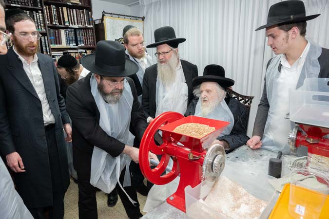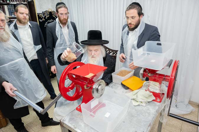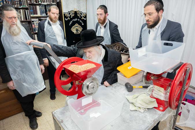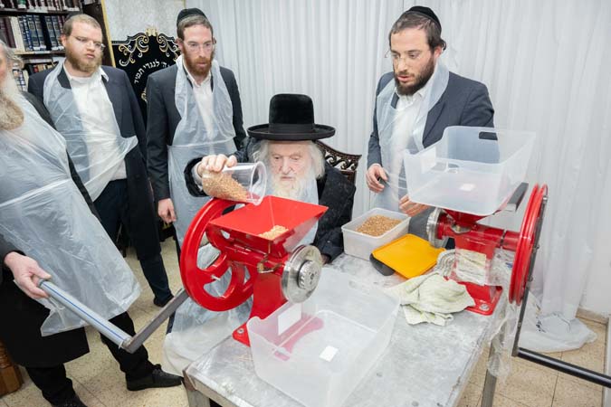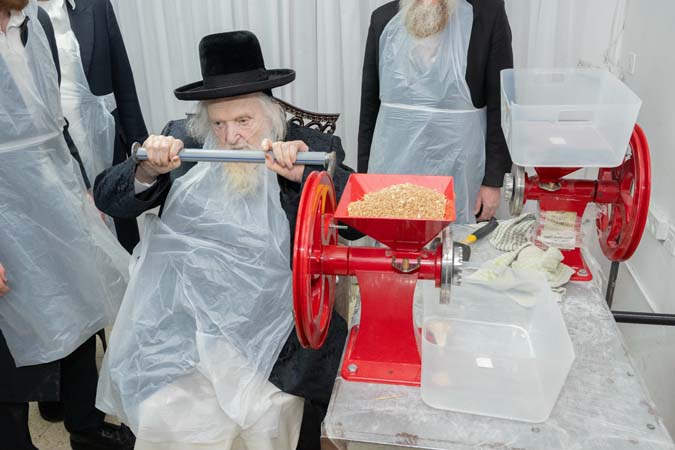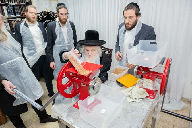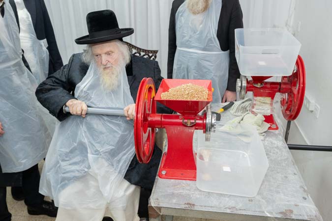 יצויין כי כבר לפני קרוב לשנה, לאחר חג הפסח תשפ”ד, יצא פוסק הדור לשדה לקצור חיטים לצורך אפיית מצות לשנת תשפ”ה, וכעת עם התקרב מועד אפיית המצות, טחן פוסק הדור את החיטים במטחנת ריחיים מהודרת שכאמור שימשה בעבר את מרן שר התורה הגר”ח קניבסקי זצ”ל.