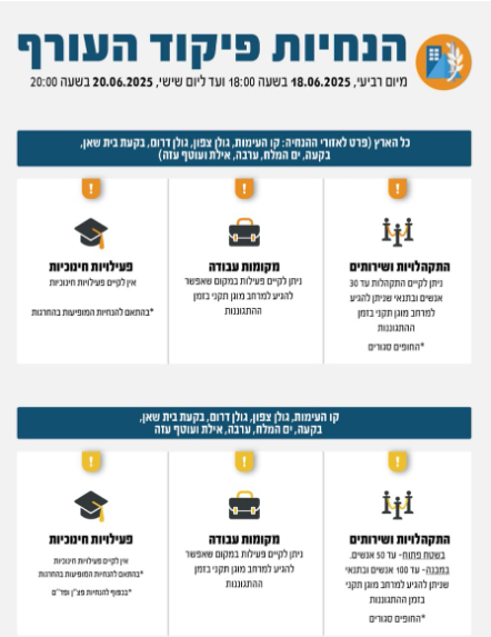 המדיניות בתוקף החל מיום רביעי, 18 ביוני 2025, בשעה 18:00 ועד ליום שישי ה-20 ביוני 2025, בשעה 20:00.