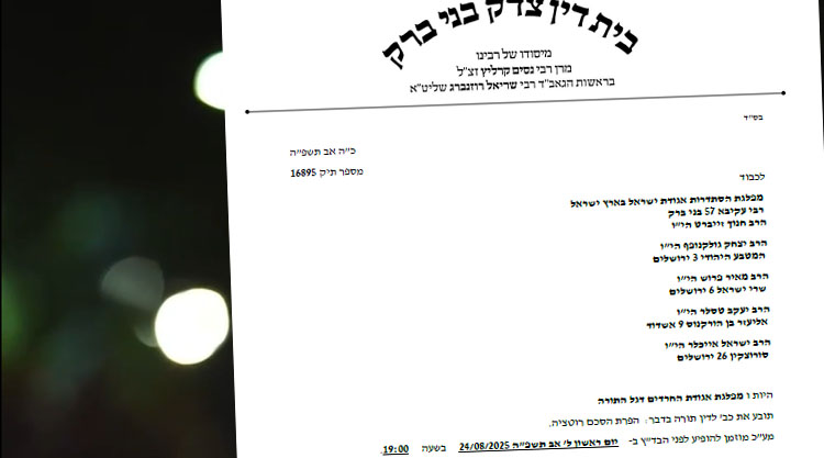 במכתב הקצר שנשלח לח”כים נכתב כי “היות ומפלגת אגודת החרדים דגל התורה, תובע את כבודו לדין תורה בדבר: הפרת הסכם רוטציה. מעלת כבודו מוזמן להופיע לפני הבד”ץ ב- יום ראשון ל’ אב תשפ”ה 24/08/2025 בשעה 19:00”.