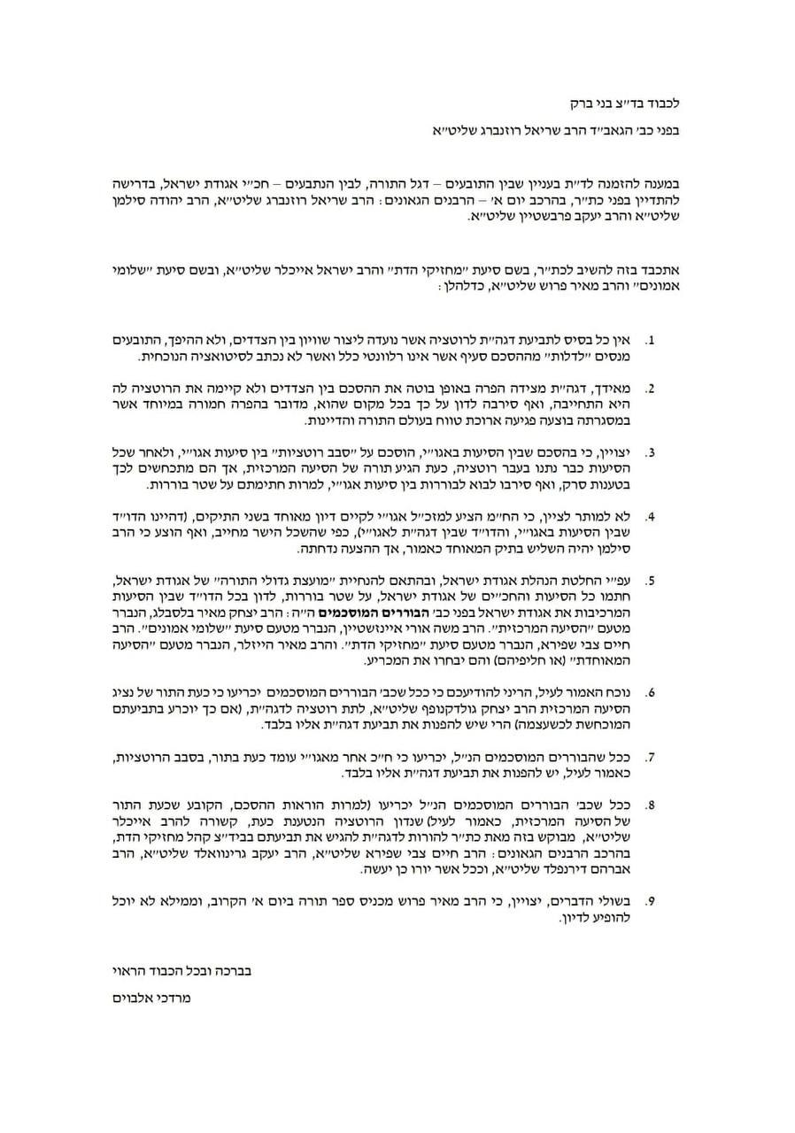 לדבריו, על פי החלטת הנהלת אגודת ישראל, ובהתאם להנחיית “מועצת גדולי התורה” של אגודת ישראל, חתמו כל הסיעות והחקיים של אגודת ישראל, על שטר בוררות, לדון בכל דין ודברים שבין הסיעות המרכיבות את אגודת ישראל בפני כב’ הבורים המוסמכים ה”ה: הרב יצחק מאיר בלסלג, הנברר מטעם הסיעה המרכזית”. הרב משה אורי אייזנשטיין, הנברר מטעם סיעת ‘שלומי אמונים’, הרב חיים צבי שפירא, הנברר מטעם סיעת “מחזיקי הדת”. והרב מאיר הייזלר, הנברר מטעם הסיעה המאוחדת והם יבחרו את המכריע.
