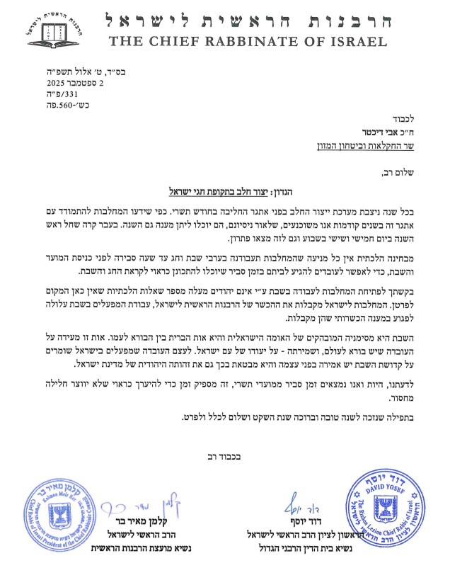 לצד זאת מבהירים הרבנים: “בקשתך לפתיחת המחלבות לעבודה בשבת ע”י אינם יהודים מעלה מספר שאלות הלכתיות שאין כאן המקום לפרטן. המחלבות לישראל מקבלות את ההכשר של הרבנות הראשית לישראל, עבודת המפעלים בשבת עלולה לפגוע במענה הכשרותי שהן מקבלות”.