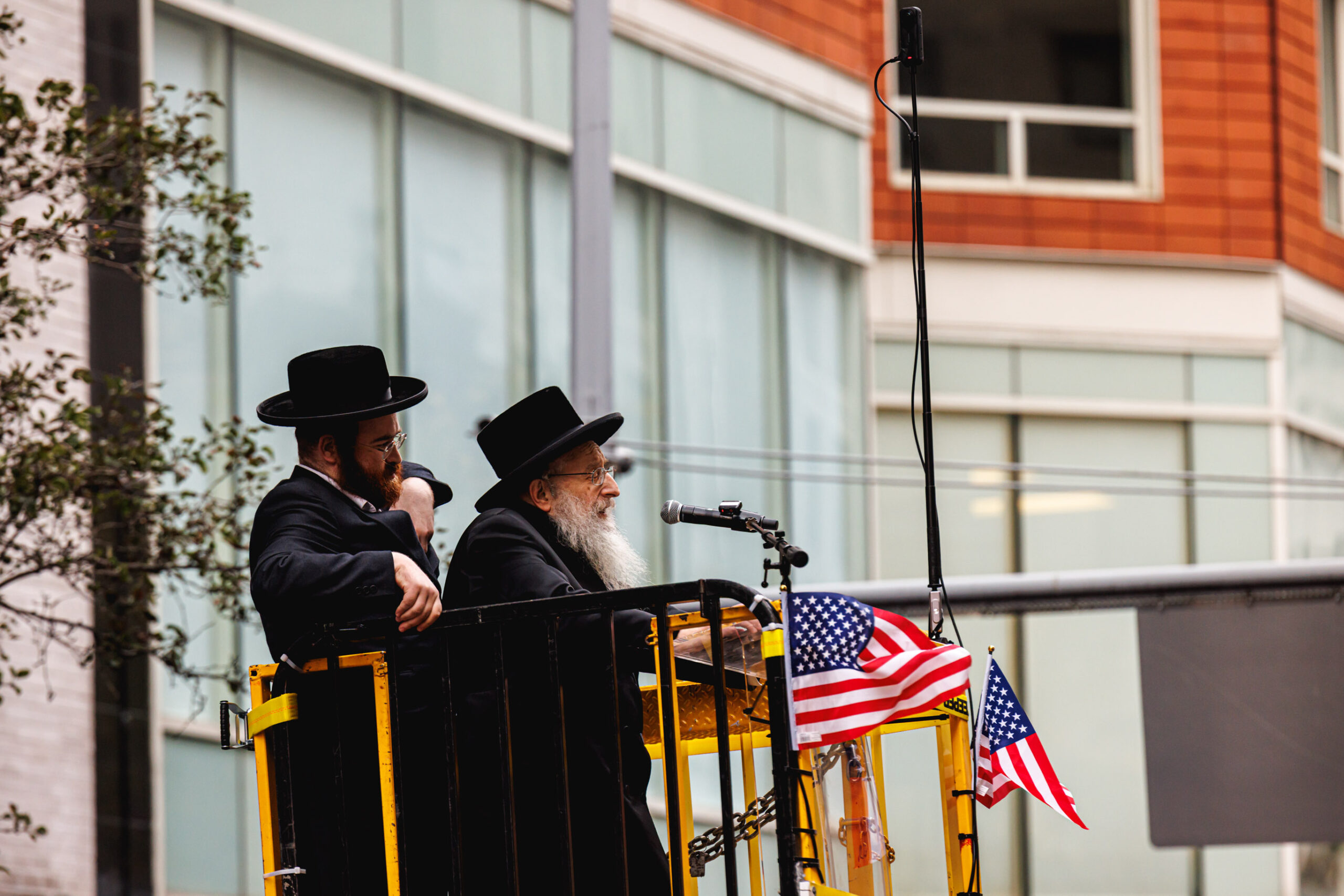 בשל התנאים לקיום ההפגנה, לא הוצבה במה גדולה, אלא למקום הובא מנוף שהרים בזה אחר זה את הרבנים וראשי הישיבות שנשאו את הנאומים. את האירוע פתח דברי פתיחה נשא, הרה”ג יהושע נחמן בערגער ראש ישיבת ‘אהל תורה’, מבורו פארק. ואחריו עלה הרה”ג דוד הירשלר מירושלים, שהיה נציג ארץ ישראל. בהמשך נשאו דברים: הרה”ג אנשיל אשכנזי, אבד”ק ‘חוות דעת’. הגה”ר יעקב הורוביץ, ראש ישיבת ‘בית מאיר’. הרה”ג שלמה שבתי קסטנבוים, דומ”ץ בביהמ”ד ‘בנין בראך’ דקהל ‘ייטב לב’ סאטמר. העצרת ננעלה עם קבלת עול מלכות שמים, שבה התכבד כ”ק האדמו”ר מבאבוב.