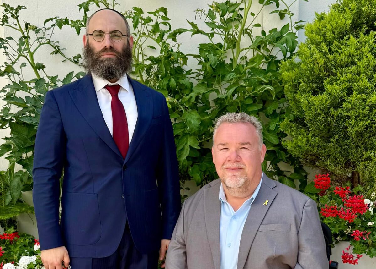מצורפת תמונה של יו״ר EJA הרב מנחם מרגולין (משמאל) יחד עם מזכ״ל EJA החדש, מר דוד לגה.