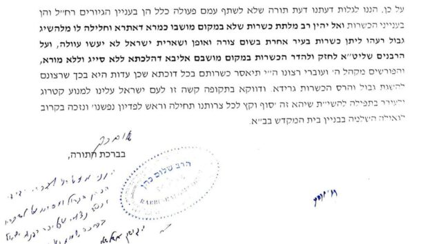 על כן, הננו לגלות דעתנו דעת תורה שלא לשתף עמם פעולה כלל הן בעניין הגיורים רח”ל והן בענייני הכשרות ואל יהין רב מלתת כשרות שלא במקום מושבו כמרא דאתרא וחלילה לו מלהשיג גבול רעהו ליתן כשרות בעיר אחרת בשום צורה ואופן ושארית ישראל לא יעשו עוולה, ועל הרבנים שליט”א לחזק ולהדר הכשרות במקום מושבם אליבא דהלכתא ללא סייג וללא מורא, והפורשים מקהל ה’ ועוברי רצונו ה”י תיאסר כשרותם בכל דוכתא שכן עדות היא בכך שרצונם להשגת גבול והרס הכשרות גרידא. ודווקא בתקופה קשה זו לעם ישראל עלינו למנוע קטרוג ולעורר בתפילה להשי”ת שיהא זה ‘סוף וקץ לכל צרותנו תחילה וראש לפדיון נפשנו’ ונזכה בקרוב לגאולה השלמה בבניין בית המקדש בב”א.