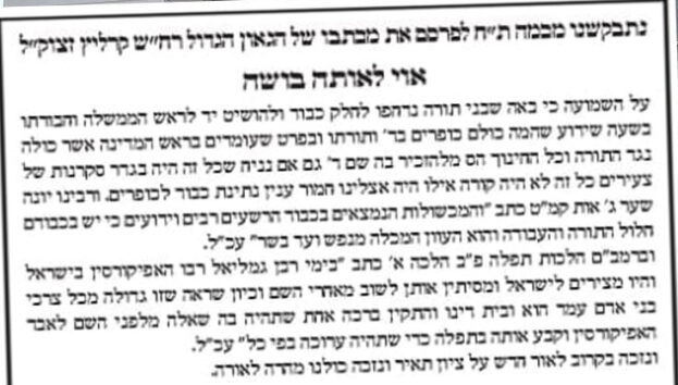 המכתב שכאמור פורסם לפני שנים, מפורסם הבוקר שוב כשבכותרתו נכתב: “נתבקשנו מכמה תלמידי חכמים לפרסם את מכתבו של הגאון הגדול רח”ש קרליץ זצ”ל”.
