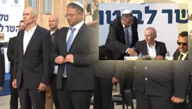 השר בן גביר שנכנס לטקס על רקע שירי קרליבך שניגנה תזמורת המשטרה, לחץ את ידיהם של הנוכחים ובכלל זה גם של מנכ”ל המשרד היוצא, ולאחריו לחץ גם את ידו של השר היוצא שהגיב בלחיצת יד קרירה למדי.