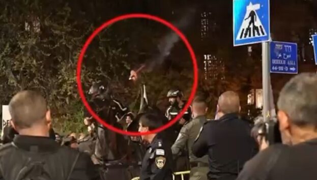 בשלב מסוים באותו הערב בסמוך לשעה 21:30, אחד המשתתפים השליך לפיד בוער לעבר פרש משטרתי ופגע בו. למרבה המזל, המעשה לא הוביל לפציעתו של השוטר ו/או הסוס המשטרתי. עפ״י החשד אותו החשוד השליך באותו הערב לפיד נוסף לכיוון השוטרים (שלא פגע באיש).