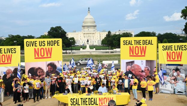 ממטה משפחות החטופים בארה”ב נמסר: “המיצג היום הוא מיצג של תקווה, מיצג שבא להזכיר לכולם איך נראה ניצחון. ניצחון הוא בראש ובראשונה איחוד משפחות, הוא השבת אהובינו הביתה לארצם, הוא רגעי האחדות המופלאים שחווינו כולנו בעסקה הקודמת. נתניהו – הצל חיים, חתום על העסקה. אל תחזור לישראל בידיים ריקות!”