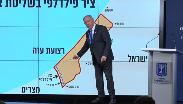 נוכחות צה”ל בציר מונעת הברחה של חטופים מעל הקרקע”, אמר ראש הממשלה שהסביר כי אם ניסוג משם ל-42 יום, יוכלו להבריח את החטופים לסיני ולאיראן. בשום אופן זה לא יקרה”.