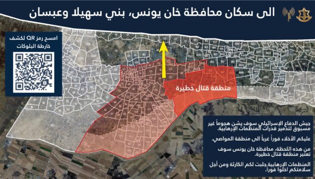 דובר צה”ל בערבית תת אלוף אביחי אדרעי, הודיע היום (שני) לתושבי חאן יונס להתפנות באופן מיידי מבתיהם. מדובר בשטח שהינו 20% משטח רצועת עזה, ועל כן מדובר במהלך משמעותי.
