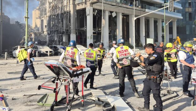 במרכז פגע טיל פגיעה ישירה בבניין ברמת גן, ובמקום נוסף בעיר הייתה נפילה שגרמה לנזק סביבתי רב. חובשים ופראמדיקים של מד”א ומתנדבי ארגון הצלה העניקו טיפול רפואי ל-22 פצועים קל במספר זירות והעניקו טיפול רפואי לגבר כבן 60 במצב קשה, עם פגיעות הדף ורסיסים. כמו כן מסייעים בארגון הצלה לחילוץ מספר אזרחים שנלכדו בזירות.