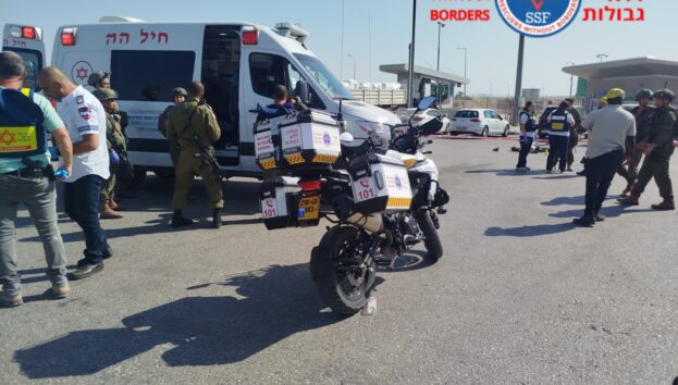 פראמדיקית ומנהלת אשכול אדומים במד”א בוסמת לובינר וחובש רפואת חירום במד”א עמית וייס, סיפרו: “הגענו למקום בכוחות גדולים וחברנו לכוחות הביטחון במעבר, הם הובילו אותנו ל-2 גברים שהיו מחוסרי הכרה עם פצעי ירי בגופם כשמעניקים להם טיפול רפואי ראשוני. המשכנו את הטיפול הרפואי שכלל ביצוע פעולות החייאה כשבסופן נאלצנו לצערנו לקבוע את מותם. המחבל נוטרל ע”י כוחות הביטחון”.